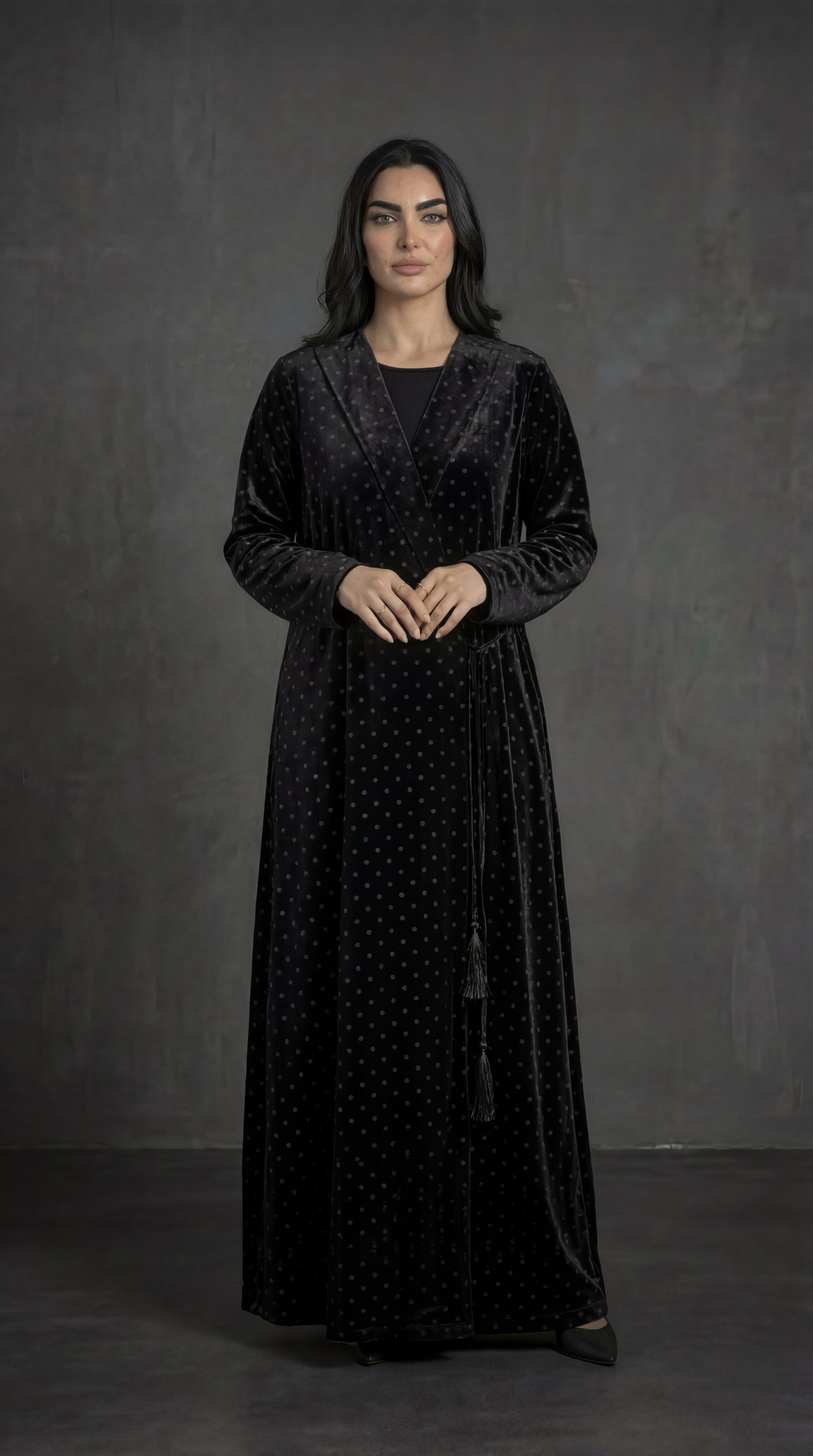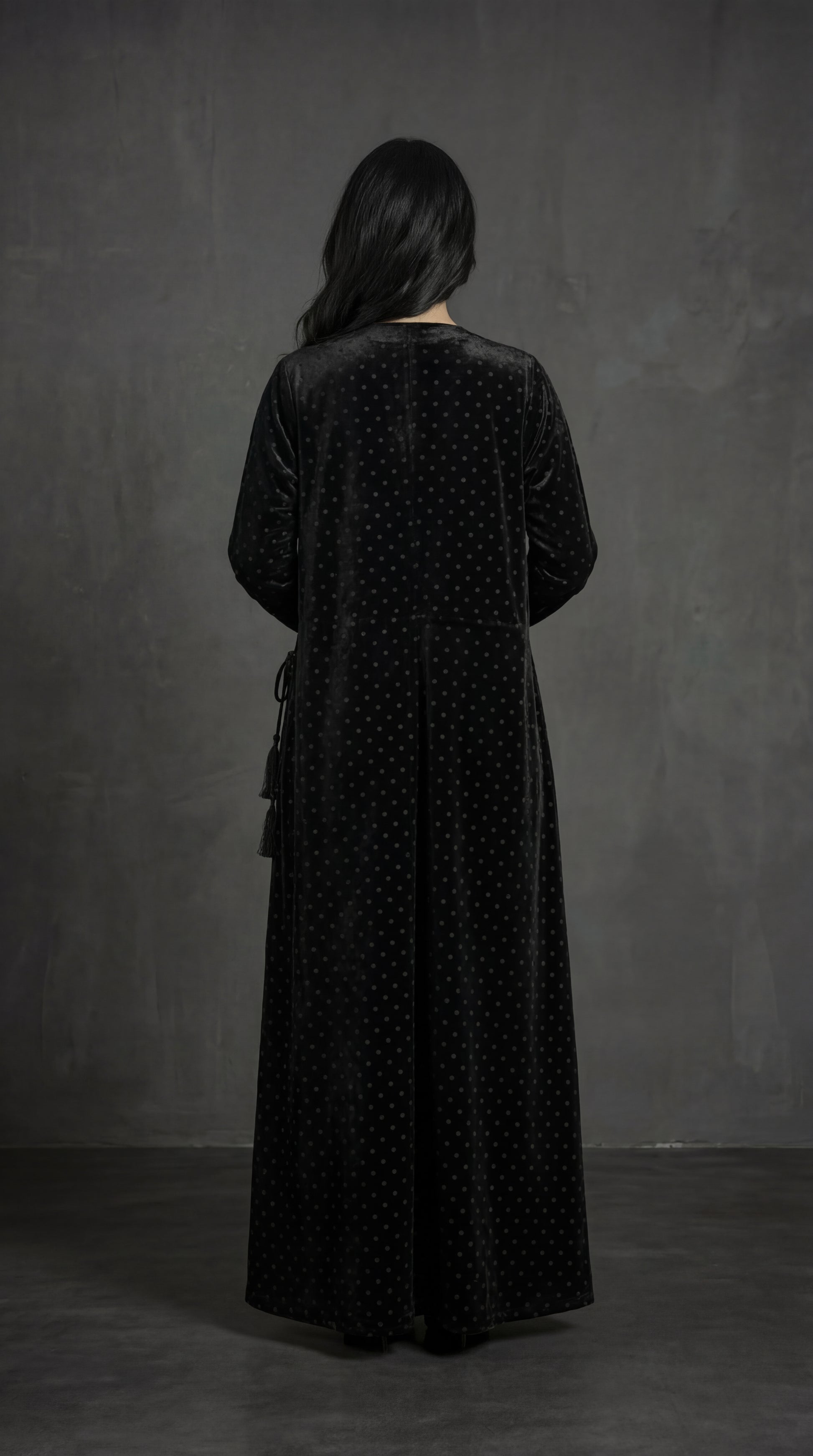 Subtle rhythm in deep black. The Noir Dot Abaya is crafted in soft velvet with a fine tonal dot pattern that reveals texture without contrast. A relaxed wrap-style silhouette with understated detailing creates ease and quiet sophistication. Designed for women who prefer softness with intention.